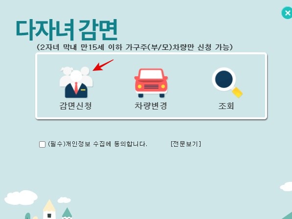2. 아래의 화면 화살표로 표시된 다자녀 감면 등록 신청을 클릭합니다.